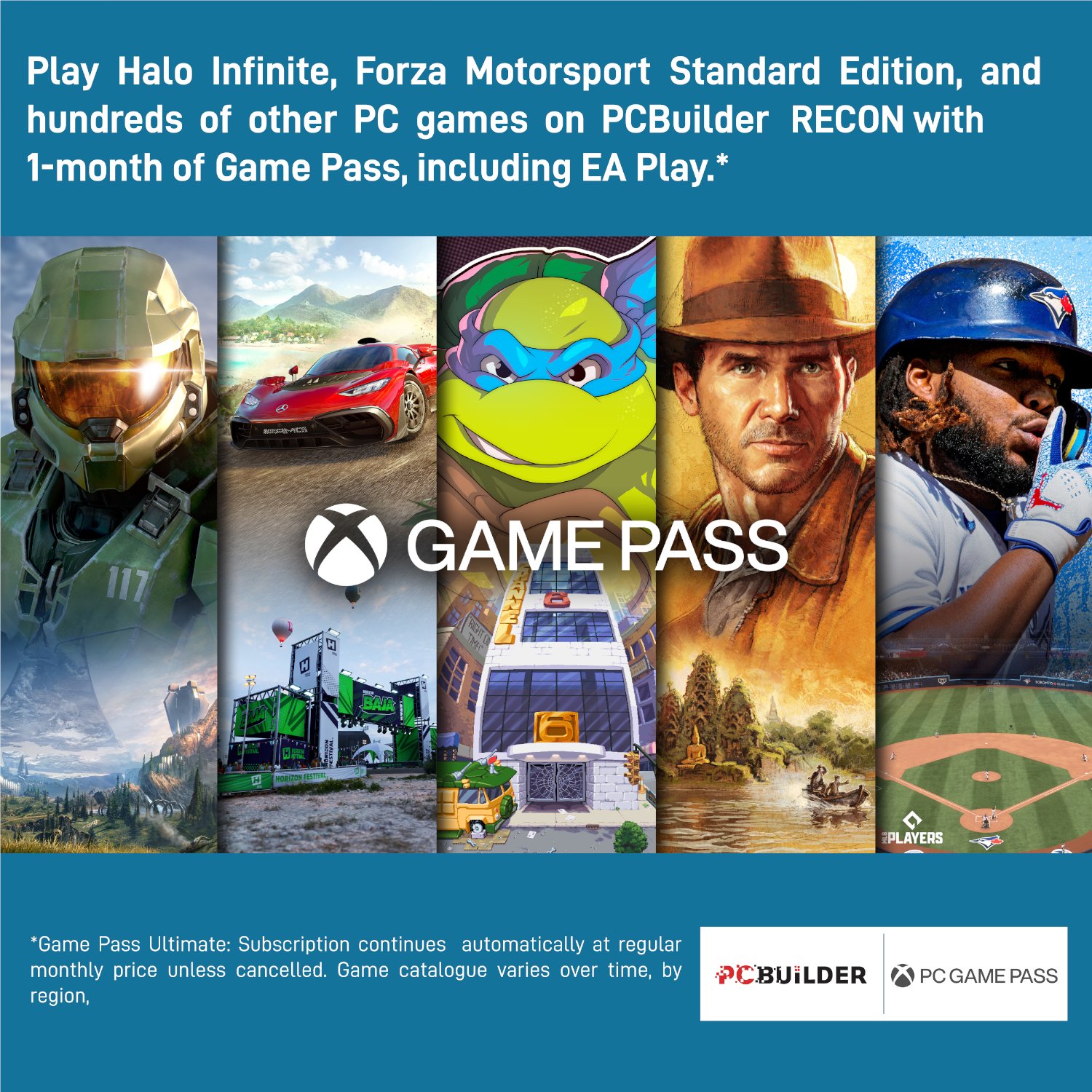 - Play over 100 high-quality PC games like Halo Infinite, Forza Horizon 5 and Teenage Mutant Ninja Turtles: Shredder’s Revenge with your new build and one month of PC Game Pass including EA Play. With new games being added all the time, there’s always something new to play from day one.