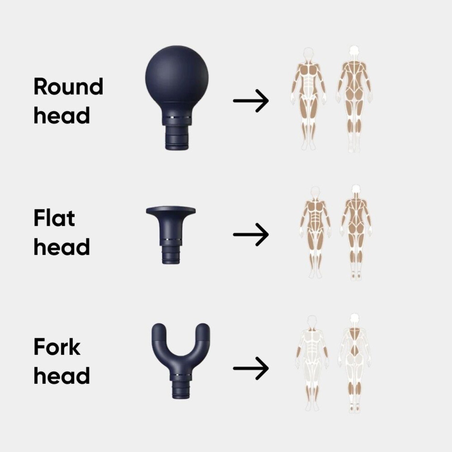 • Target different muscle groups effectively with three interchangeable massage heads.